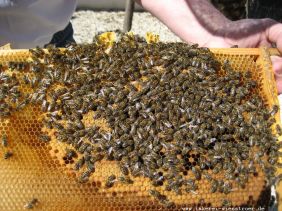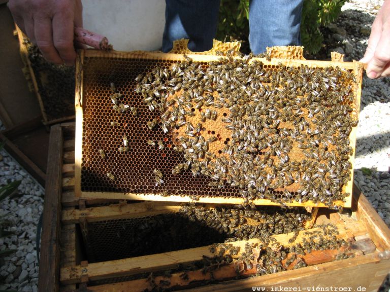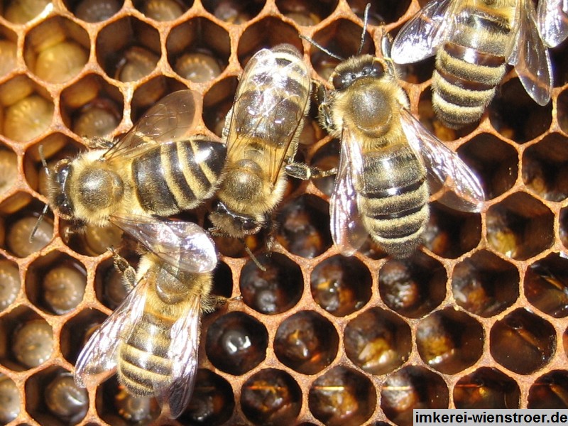 Zu meiner Betriebsweise gehört eine eigene Königinnenzucht. Jedes Jahr kaufe ich in Kirchhain 1-2 Reinzuchtköniginnen (Instrumental besamt) von diesen Königinnen wird dann durch umlarven nach gezüchtet. Die Begattung erfolgt auf dem Stand. So erhalte ich jedes Jahr junge Königinnen, fleißig, sanftmütig schwarmträge, das ist der Garant für eine erfolgreiche Betriebsweise.