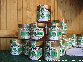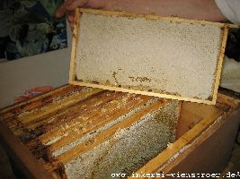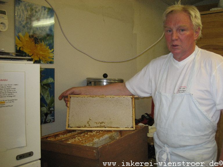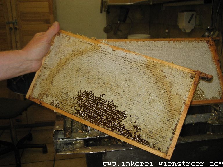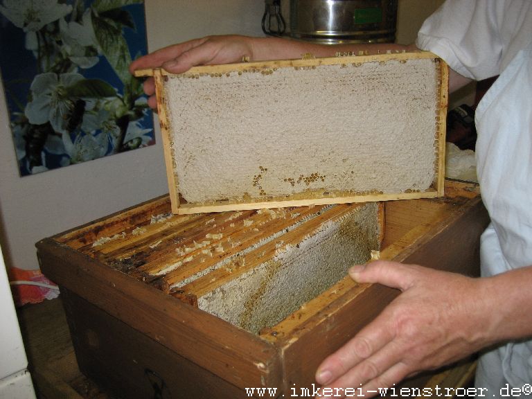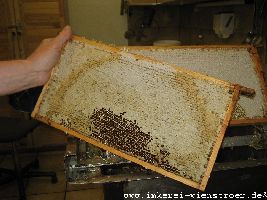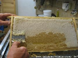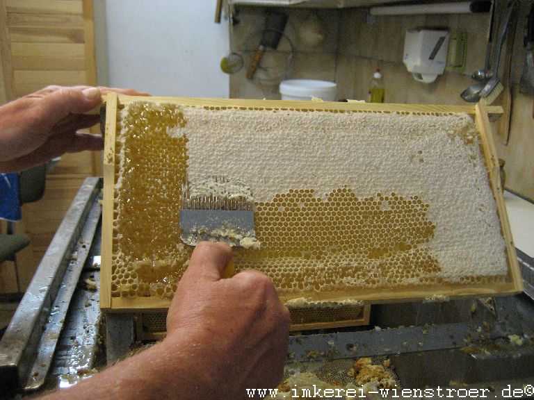 Der Honig wird bei mir klassisch geerntet. Das heißt mit der Entdeckelungsgabel werden die Zelldeckel entfernt. Weder Heißluftföhn noch Gasbrenner finden Verwendung. Da ich nur biologische Varroabekämpfungsmittel einsetze, kann ich mein Entdeckelungswachs mit dem anhaftenden Honig zur Herstellung von köstlichem Bärenfang gebrauchen.
